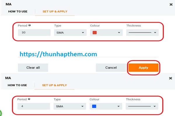 Lặp lại quy trình tương tự để thiết lập dòng SMA30. Thay đổi thời gian thành 30 và màu sắc hiển thị đường SMA30 thành màu đỏ.