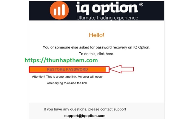 Sau khi xong bước 1, IQ Option sẽ gửi cho bạn 1 email thông báo “Khôi phục mật khẩu”. Bạn nhấn vào Restore Password để tiếp tục.
